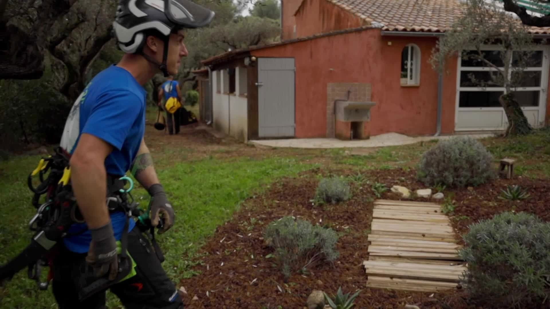 Abattage de gros pins filmé par drone